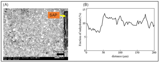 (A) SEM-BSE image, and (B) volume fraction of unhydrated cement from SAP surface.