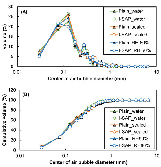 (A) distribution, and (B) cumulative volume of air bubbles in concrete.