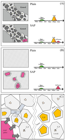 Schematic diagram of microstructure of (A) concrete; (B) cement paste with and without SAP; and (C) mechanism of cement matrix densification.