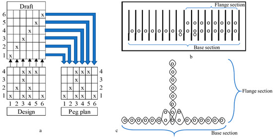 Weaving of T-profile: (a) weave design, draft and peg plan; (b) denting plan; (c) warp cross sectional view of T-profile.
