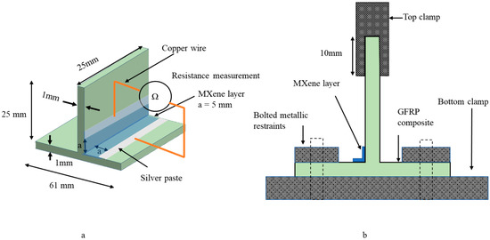 Five specimens were cut to dimensions, as shown in Figure 3a,b, and tensile tested on an Instron ElectroPuls E10000T (Instron, Norwood, MA, USA) machine with a testing speed of 2 mm/min and a load cell capacity of 10 kN. The specimens were mounted as shown in Figure 3b. The base section of the composite was bolted to the bottom clamp with electric-insulating tape and the flange section of the composite was gripped in the top clamp with electric-insulating sandpaper to reduce slippage. Copper wires were soldered on the MXene coating and a silver paste was applied to reduce the contact resistance. The change in electrical resistance during tensile testing was measured using the two-probe method, shown in Figure 3a, via a Fluke 287 RMS multimeter (Fluke Corporation, Everett, WA, USA) with a Bluetooth data-logging system, whereas the contact resistance of 0.8 Ω was measured by taking the difference between the two-probe and four-probe methods of the multimeter contacts.
