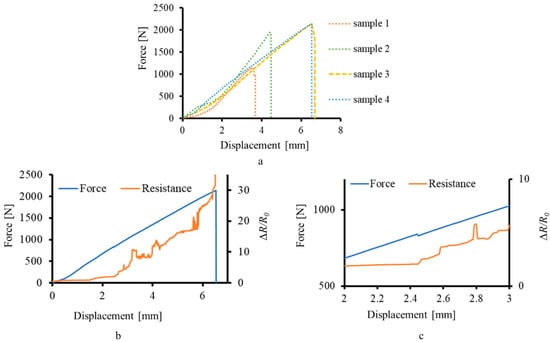 The graphs of force–displacement were plotted for four composite T-profile samples, as shown in Figure 4a. One sample was rejected out of five due to premature failure at the clip restrains. It was observed that the graph can be divided in two distinct zones, i.e., initial failure and final failure. Initial failure is usually detected as a drop in the tensile load values for the first time [40]. The curves of force and resistance show a statistically monotonic relationship, so its product-moment correlation coefficient was calculated by taking the ratio of covariance to standard deviation of force and absolute resistance datapoint values, for each of the four samples, presented in Table 2 along with the ultimate force of each sample. The range of the correlation coefficient is from −1 to 1, where −1 indicates a purely inverse relation and 1 indicates a purely direct relation between the datasets. As the behaviour of all the graphs is similar, the piezoresistive response of the MXene coating of one sample is shown in Figure 4b by plotting ∆R/R0 against force–displacement. The piezoresistive response of the MXene coating, corresponding to the deformation of the sample, matches well with the previous studies related to MXene-based SHM of composites [10,29].