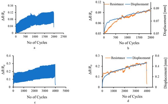 Real-time fatigue sensing of composite T-profile by MXene coating: (a) resistance measurement at 50 N–0.5 Hz; (b) sensing of displacement component during fatigue loading of 2000 cycles; (c) resistance measurement at 100 N–1 Hz; (d) sensing of displacement component during fatigue loading of 4000 cycles.