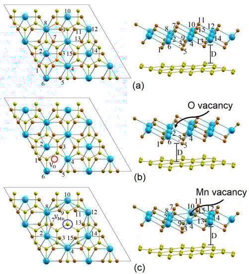In order to analyze the effects of the VO and VMn vacancies on the structural properties of the heterostructure, the interfacial distance D is introduced, which defines the separation between the T–MnO2 monolayer and the graphene. D is calculated for the heterostructure with vacancies and is compared with the interfacial distance without vacancies. Additionally, in order to determine the variation in the bond lengths between the atoms that are first neighbors of the vacancy, the atoms are labeled from 1 to 15. In this way, the bond lengths between an atom of Mn and of O in general are denoted as li-j (the distance between atoms i and j). These li-j lengths were calculated for the heterostructure with VO and VMn vacancies and were compared with the li-j lengths of the heterostructure without vacancies.