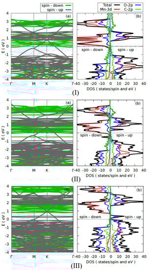 Electronic structure: (a) diagram of the energy bands and (b) DOS of the (I) T–MnO2/graphene without a vacancy, (II) T–MnO2/graphene with VO, and (III) T–MnO2/graphene with VMn. The dotted line represents the Fermi level.