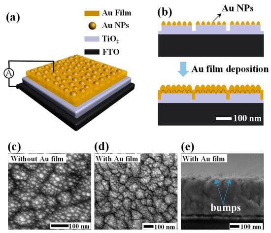 (a) 3D schematic diagram of the proposed plasmonic HEPD with a configuration of FTO/TiO2/Au NP/Au film. (b) 2D cross-sectional diagram of the HEPD illustrating the conformal deposition process for preparing the transparent Au film. (c,d) Top-view SEM images of the FTO/TiO2/Au NP multilayer sample and the proposed HEPD. (e) Cross-sectional SEM image of the proposed HEPD.
