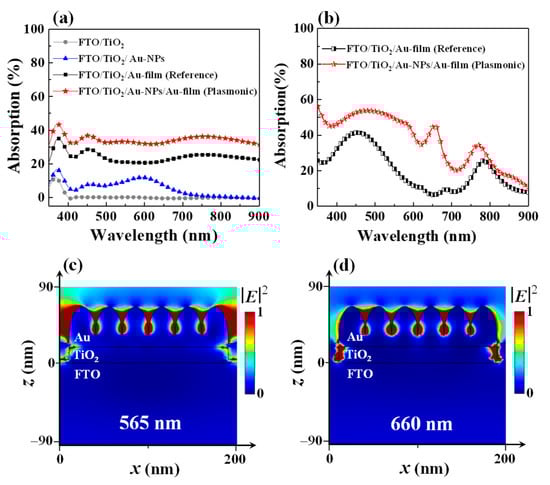 (a) Absorption spectra of the hybrid plasmonic and reference HEPDs with the configurations of FTO/TiO2/Au NP/Au film and FTO/TiO2/Au film, respectively. For comparison, the absorption spectra of the multilayer structures with the configurations of FTO/TiO2 and FTO/TiO2/Au NPs are also displayed. (b) Simulated absorption spectra of the hybrid plasmonic and reference HEPDs. Simulated maps of electric filed amplitude |E|2 of the hybrid plasmonic at the wavelengths of 565 nm (c) and 660 nm (d).
