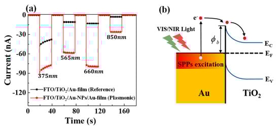 Next, we compare the photocurrent performances of the hybrid plasmonic and reference HEPDs when the wavelength of the incident light is tuned (λ = 375 nm, 565 nm, 660 nm, and 850 nm, as displayed in Figure 3a). The transient current (I-t) characteristics of the two HEPDs were measured under illumination by LED lamps with the power density fixed to 10.2 mW/cm2, using the semiconductor analyzer (Agilent B1500A, Keysight Technologies, Malaysia). The photosensitive area of HEPDs is defined by the intersection of the top and down electrodes (0.04 cm2). It should be noted that all photo responses are measured under zero bias, since applying a bias would induce the hot carrier signal to be submerged in the injected background carriers. The direction of current flow from the Au electrode towards the FTO electrode is specified as positive. Thus, the acquired negative currents under illumination in Figure 3a confirm that the hot electrons successfully transfer into the TiO2 layer from the adjacent Au. The schematic diagram of this hot electron transfer process is illustrated in Figure 3b. As shown in Figure 3a, at the four investigated wavelengths, the photocurrents of the hybrid plasmonic HEPD device at four wavelengths are much higher than their individual references. Here, we obtain a photocurrent enhancement factor of 610% at 660 nm and 960% at 850 nm, and the light to dark current ratio of the hybrid plasmonic HEPD at 660 nm reaches 1747. For the hybrid plasmonic HEPD, the stronger absorption in the adjacent Au layer (Au NPs plus the Au film) can account for the significantly improved photocurrent. It can be noticed that the photocurrent enhancement factor is much greater than the absorption enhancement factor (41.7%) derived from Figure 2a. This could be ascribed to the non-uniform hot carrier transfer rates in different regions, which can induce variation in the subsequent carrier collection efficiency. It is deduced that the opportunities of hot carriers generated on the arrayed Au NPs transferring into the TiO2 layer are greater than those of hot carriers generated in the Au grooves between neighboring TiO2 bumps. It can also be observed that the photocurrent enhancement factors at the visible and NIR ranges are much stronger than that at the UV wavelength (375 nm). The relatively weak photocurrent enhancement factor at 375 nm is because the photocurrent generated by TiO2 intrinsic absorption contributes to a current that flows with the direction opposite to that of the hot carrier current.