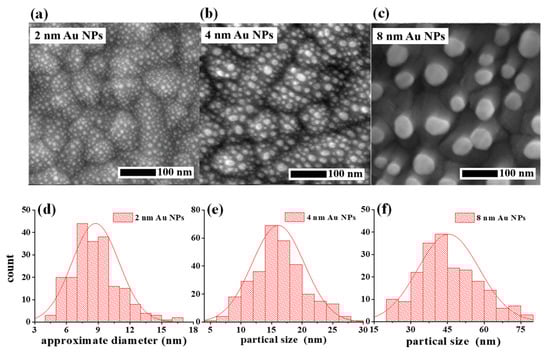 (a–c) Top-view SEM images of the FTO/TiO2/Au NP multilayer samples when the nominal thickness tn of the Au film subjected to the thermal treatment is tuned. (d–f) Histograms of the average size of the Au NPs with tuned tn.