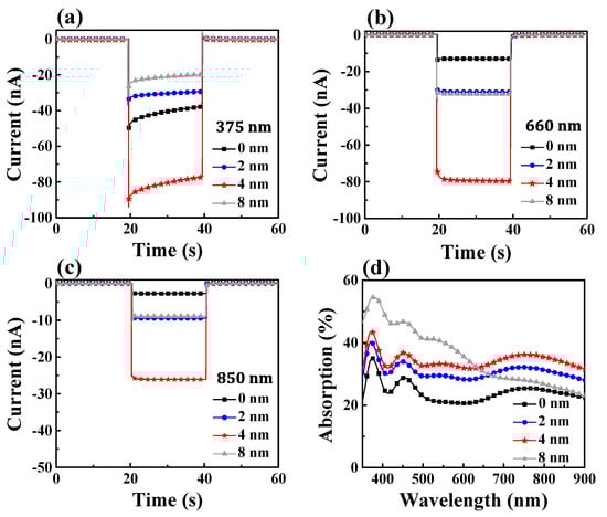 Transient photocurrents of the hybrid plasmonic HEPDs depending on varied Au NPs (by tuning tn =0, 2, 4, and 8 nm) under illumination of 375 nm (a), 660 nm (b), and 850 nm (c) light. (d) Measured absorption spectra of the HEPDs with different Au NPs.
