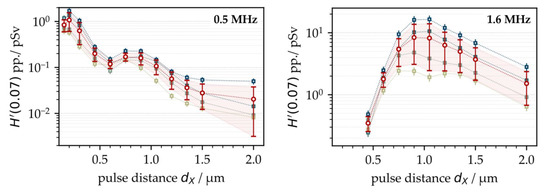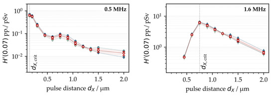 First, the X-ray emission dose per pulse H′(0.07)PP was investigated as a function of the intra-line pulse distance and PRF. Therefore, ultrashort pulses with a peak intensity of I0 = 1.5 × 1013 W/cm2 were irradiated at fP = 0.5 MHz and 1.6 MHz. The intra-line pulse distance was varied in the range of 0.15 µm < dX < 2.0 µm by increasing the scan speed from 75 mm/s to 3200 mm/s, depending on the respective PRF, while the hatch distance was kept constant at dY = 20 µm. The X-ray emission dose per pulse, as shown in Figure 1, was derived from the averaged SILIX detector readings captured in individual test series on four different days. At fP = 0.5 MHz, the highest X-ray emission dose per pulse of H′(0.07)PP = 1 pSv was detected at 0.2 µm. For the larger intra-line pulse distances, there was a clear tendency towards lower X-ray emissions. Therefore, at dX = 2 µm (representing the widest studied distance) the X-ray emission dose per pulse reduced up to two orders of magnitude to H′(0.07)PP = 0.02 pSv, which emphasized the great effect of intra-line pulse distance on laser-induced X-ray emissions.