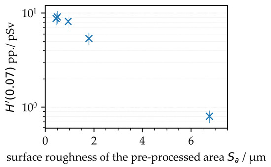 The highest X-ray emission dose per pulse of H′(0.07)PP = 9.1 pSv was captured for the smooth surface, which was laser-pretextured with dX = 3.0 µm and Sa = 0.49 µm corresponding area roughness, Figure 3. For the dX = 1.5 µm laser-pretextured surface and resulting Sa = 0.94 µm, the X-ray emission dose per pulse was marginally lower in the range of H′(0.07)PP = 8.2 pSv. These X-ray emission doses were almost equal to the ones measured for the nontextured basic material of similar surface roughness, Sa = 0.44 µm. For the rougher surfaces featured with area roughness measures of Sa = 1.8 µm and 6.8 µm resulting from laser pretexturing at smaller intra-line pulse distances of dX = 0.9 µm and 0.6 µm, respectively, the detected X-ray emission doses per pulse amounted to H′(0.07)PP = 5.4 pSv and 0.9 pSv, respectively. Remarkably, these dose values were even below the X-ray emissions arising from laser processing of the nontextured steel surface at dX = 0.6 µm in Figure 1 (right), which was proof for the screening of laser-induced X-ray photons by rough surface features.