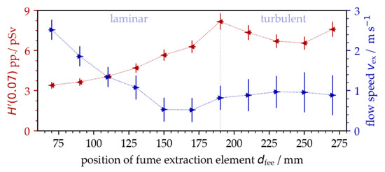 After a detailed inspection of the experimental conditions, both the position of the fume extraction element (FEE) related to the processing area, as well as the suction flow speed vfs, were identified as potentially influencing factors for the monitored different X-ray emission dose levels. For a more precise investigation of this effect, the distance of the FEE from the processing area deff was varied during the measurements of X-ray photon emission arising from laser surface processing with pulses of I0/FX = 1.5 × 1013 W/cm2, fP = 1.6 MHz, and dX = 0.75 µm. As another control parameter, the suction flow speed was monitored at the center position of the laser-processed field using a resistance anemometer. The measurements showed a continuous reduction in the suction flow speed with increasing distance of the FFE from the processing area, Figure 4. At about a 190 mm distance, the suction flow turned from laminar to turbulent, which was indicated by the larger deviation of the measured suction flow speed. From this position, no further reduction in the suction flow speed was detected with larger distances because the cross jet air flow protecting the focusing objective was more predominant within the processing area.