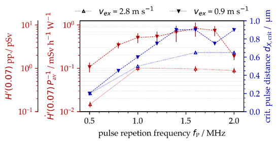 A detailed analysis of the results obtained showed that the critical intra-line pulse distance for the maximum X-ray emission dose was strongly affected by the specifically applied PRF. For example, the critical intra-line distance was dX,crit = 0.2 µm at fP = 0.5 MHz, enlarging to dX,crit = 0.9 µm at fP = 1.4 MHz and above, Figure 6. Therefore, a potential explanation can be found in the complex interaction of the laser beam with the plasma plume induced by preceding pulses in a pulse train. Moreover, in the particular case of low-intense ultrashort pulses irradiating at MHz PRF, plasma resonance absorption might be the dominant absorption mechanism for the laser beam, which was already evidenced in a previous work [7]. This, in turn, implies optimum plasma characteristics in terms of the degree of ionization, plasma carrier density, dimension and flank angle of the critical plasma density layer, etc., for the most efficient coupling of impinging optical pulse energies with the laser-induced plasma plume. In fact, plasma plume formation and expansion are highly dynamic processes [8]. Therefore, it became evident for the dynamically changing plasma plume that both timing (defined by PRF) and position (defined by intra-line pulse distance) of the next impinging laser pulse had a great effect on optimum laser beam coupling resulting maximum X-ray photon emission. The general trend of increasing X-ray emission dose and enlarging critical intra-line pulse distance with higher PRFs can be seen in Figure 6 for two different suction flow speeds: vfs = 0.9 m/s and 2.8 m/s. In addition to the X-ray emission dose per pulse, for a better comparison to the literature data, the measured values are also presented in the form of X-ray emission dose rate per irradiated laser power. The higher X-ray dose values and the larger critical intra-line pulse distances were found for the lower suction flow speed, which is in line with the data presented above in Figure 4. In this context, it is worth mentioning that the highest X-ray emission doses can be seen in Figure 6 with about same value of 0.8 mSv/h/W for PRFs ranging between 1.0 MHz and 1.8 MHz. This broad range of MHz PRF for the highest X-ray emissions seems to be contrary to previous results (e.g., Figure 5 (right) shows a distinct maximum at 1.6 MHz). The X-ray emission doses of Figure 6, however, represent maximum values that were achieved at different intra-line pulse distances.