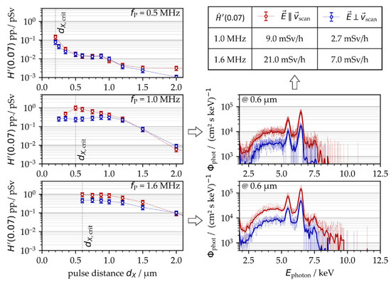 In addition to PRF and intra-line pulse distance, the polarization state of the laser beam was another enhancing effect of ultrashort pulse laser-induced X-ray emissions, Figure 7. This applies in particular to MHz pulses and linear polarization aligned parallel to the beam scanning direction. When comparing with the perpendicularly polarized laser beam, a maximum four-fold increase in X-ray emission was figured out for the fP = 1.0 MHz repetitive pulses irradiating at a dX,crit = 0.5 µm critical intra-line pulse distance, Figure 7 (left, middle). At the higher PRF of 1.6 MHz, the X-ray emission of the parallel-polarized laser beam was about twice the X-ray dose obtained with perpendicular polarization, Figure 7 (left, bottom). A difference by the factor of two between the X-ray emission dose levels was also observed for the 0.5 MHz pulses irradiated either parallel or perpendicularly polarized with respect to the laser beam scanning direction, Figure 7 (left, top). The maximum X-ray emission dose levels of Figure 7, ranging up to H′(0.07)PP,max = 1 pSv, were almost one order of magnitude below the values presented above in Figure 5 of H′(0.07)PP,max = 10 pSv. This is mainly due to the fact that different suction flow speeds were applied (vfs = 0.9 m/s in Figure 5 vs. 2.8 m/s in Figure 7), which further confirms the strong impact of suction flow speed on X-ray photon emission already shown above in Figure 6. From these results, it can be postulated that the suction flow speed manipulated the shape of the plasma plume, which, in turn, affected the efficient coupling of the following laser pulses into the plasma under resonant absorption conditions. The proposed influencing effect of laser beam polarization on X-ray emission can also be assessed from the X-ray emission spectra provided in Figure 7 (right) showing higher X-ray photon yields and wider X-ray spectra that were further enlarged to higher X-ray photon energies for the parallel-polarized laser beam.