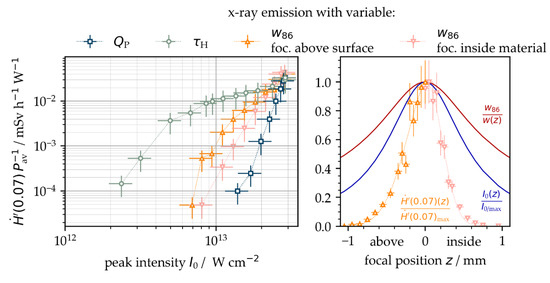In Figure 8 (left), the pulse energy showed the greatest effect on the released dose rate when comparing the X-ray emissions from pulses of varying peak intensities. This was validated by the steepest curve growth (blue, squares) in the (0.07) vs. I0 log-log plot. At a fixed peak intensity, the pulses of longer pulse duration induced higher X-ray emission dose levels (green, circles). The results also confirm that pulse duration affected the threshold intensity value, where X-ray photons were detected for the first time. For example, the intensity threshold was figured from I0/UFFL = 1.3 × 1013 W/cm2 for 340 fs pulses. In contrast, with the longer 10 ps pulses, the X-ray photon emission started at I0/UFFL = 2.3 × 1012 W/cm2. This was about four times below the legal peak intensity limit for approval-free laser operation in Germany. Moreover, the corresponding (0.07) = 10 µSv/h for the applied low-intense 30 W average power laser beam exceeded considerably the permitted 1 µSv/h maximum X-ray emission dose rate.