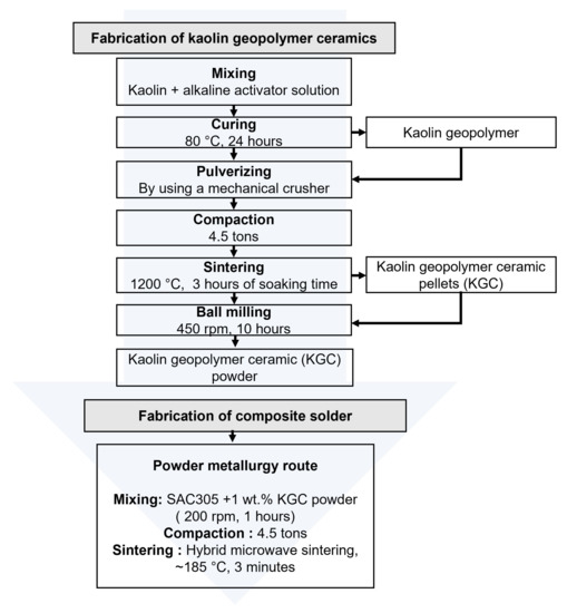 Figure 1 shows the flowchart of the kaolin geopolymer ceramic and composite solder fabrication process. Sn-3.0Ag-0.5Cu (SAC305) powders were used as the solder matrix material. It has a spherical morphology and an average size of ~25–45 µm, purchased from Nihon Superior Co. Ltd. (Osaka, Japan). The kaolin geopolymer ceramic (KGC) powders with an average particle size of ~18 µm were used as the reinforcement material.