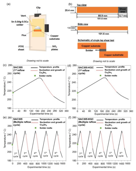 (a) Schematic diagram of sample cell for the in situ soldering synchrotron observation, (b) Schematic diagram illustrating the configuration for single lap shear test, temperature profile, and growth behavior of primary Cu6Sn5 for (c) SAC305 1st reflow cycle, (d) SAC305-KGC 1st reflow cycle, (e) SAC305 multiple reflow cycle (2nd to 6th cycle), and (f) SAC305-KGC multiple reflow cycle (2nd to 6th cycle).