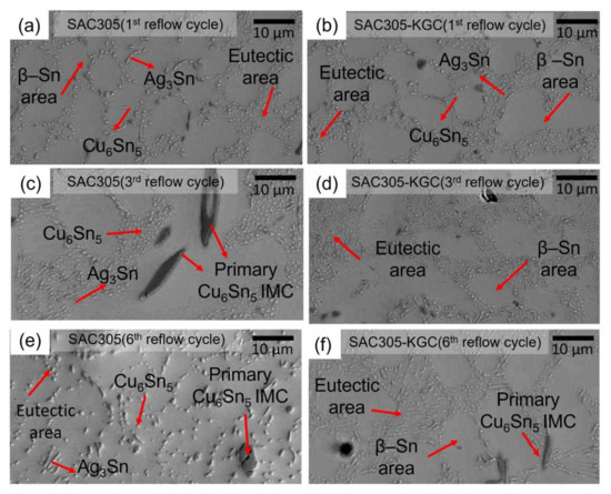 The microstructure of the solidified SAC305 and SAC305-KGC solder joints after the first, third, and sixth cycles of reflow soldering is shown in Figure 3. The microstructure of SAC305 solder alloys consists of fractions of β-Sn phase and eutectic phases. Based on Figure 3, the β-Sn and eutectic areas were observed in both materials of SAC305 and SAC305-KGC solder joints for multiple cycles of reflow soldering. Fine dots Cu6Sn5 and needle-like Ag3Sn IMC formed in the eutectic area as observed in Figure 3. In this study, hypoeutectic SAC305 solder was soldered on a copper substrate and as a result of Cu diffusion and dissolution during soldering, primary Cu6Sn5 will form in the solder joint [26,33]. Per Figure 3a,c,e, IMC particles in the eutectic areas of the SAC305 solder joints are coarse compared to the SAC305-KGC solder, suggesting that the addition of kaolin geopolymer ceramic (KGC) in SAC305 solder alloy suppresses further coarsening of IMCs in the eutectic area after multiple cycles of reflow soldering.