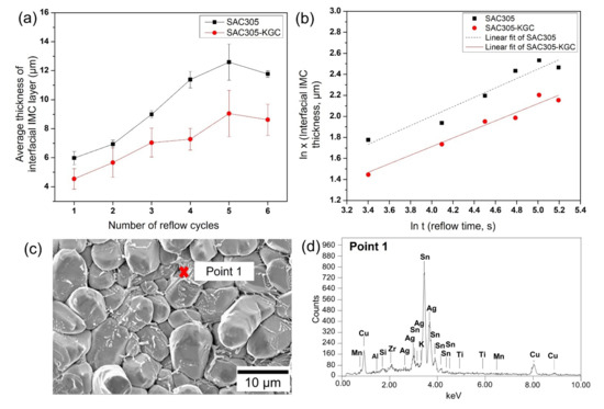 The measured average thickness of the interfacial IMC layer for different reflow cycles was plotted and shown in Figure 5a. Initially, the interfacial IMC layer in the SAC305 solder joints grows to an average thickness of ~5.9 µm. After multiple cycles of reflow soldering, the interfacial IMC layer grows to a maximum of ~12.6 µm in SAC305 solder joints. Meanwhile, in the SAC305-KGC solder joints, the interfacial IMC layer grows to an initial average thickness of ~4.5 µm and a maximum of ~9.4 µm after multiple cycles of reflow soldering. The average thickness of the SAC305-KGC solder joints was thinner than SAC305 solder joints, inferring that the addition of KGC might play a role in suppressing the increasing thickness of the IMC layer during multiple cycles of reflow soldering. The thickness of the interfacial IMC layer after multiple cycles of reflow soldering can be generally described per the empirical power law equation [1,6,36,39]: