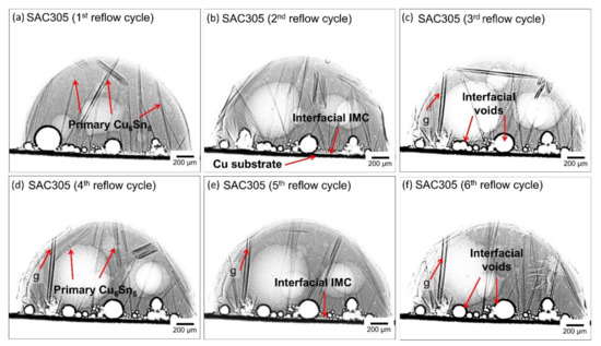 Synchrotron radiation images of SAC305-KGC showing the formation of primary Cu6Sn5 IMC with respect to multiple cycles of reflow soldering.