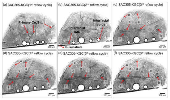 - It was also observed that after the third cycle, the primary Cu6Sn5 IMCs in SAC305-KGC did not fully melt during subsequent heating of the fourth, fifth, and sixth cycle of reflow soldering and grew with two growth directions, which differs from SAC305 where the primary only grows with one growth direction. The results obtained were likely related to the mechanism of adsorption of KGC particles on the surface of primary Cu6Sn5 IMCs during multiple reflow soldering.