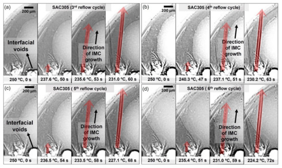 Sequences of the image showing the growth of IMC in SAC305-KGC solder joints during (a) 3rd reflow cycle, (b) 4th reflow cycle, (c) 5th reflow cycle, and (d) 6th reflow cycle (t = 0 s when the sample begins to cool).