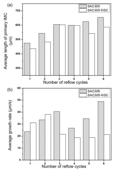 (a) Average length of the primary IMC in SAC305 and SAC305-KGC, and (b) Average growth rate of primary IMC in SAC305 and SAC305-KGC.