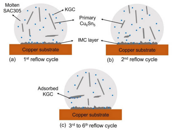 The proposed mechanisms are shown in Figure 12 for the effects of KGC particles, described as follows; during the reflow soldering, the KGC particles were likely to segregate into the molten solder [32]. As a result, some KGC particles were adsorbed on the primary Cu6Sn5 IMC and onto the copper substrate. Increasing the reflow cycle resulted in more KGC particles adsorbed onto the primary Cu6Sn5 IMC, which causes the growth rate of the primary Cu6Sn5 IMC to decrease from the third until the sixth cycle of reflow soldering, as depicted in Figure 11b, compared to SAC305. The growth orientations are likely to change with adsorbed KGC since primary Cu6Sn5 IMC exhibited two growth directions compared to SAC305, with one growth direction along with <0001> during multiple reflow soldering. Additionally, the adsorbed KGC is likely to disturb the melting of the primary Cu6Sn5 IMC during the subsequent heating cycle from the third to the sixth cycle of reflow soldering.
