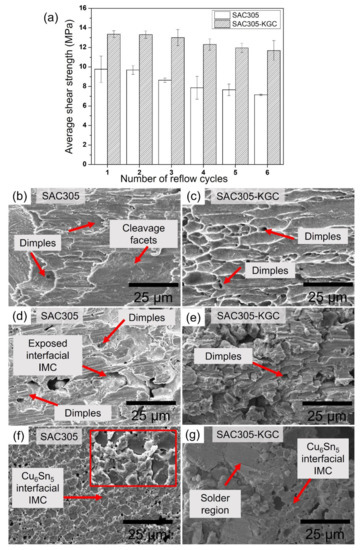 (a) Shear strength of SAC305 and SAC305-KGC subjected to multiple cycles of reflow soldering. SEM fracture surface of (b) SAC305 at 1st reflow, (c) SAC305-KGC at 1st reflow, (d) SAC305 at 3rd reflow, (e) SAC305-KGC at 3rd reflow, (f) SAC305 at 6th reflow, and (g) SAC305-KGC at 6th reflow cycle.
