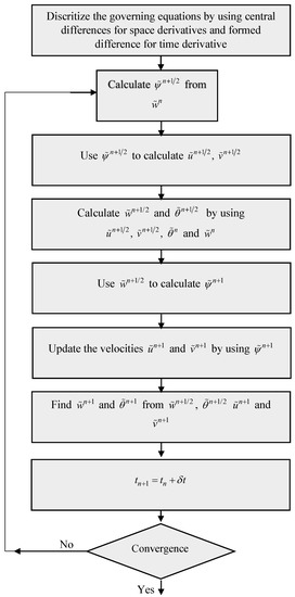 The pseudo transient approach can solve complex dynamical nonlinear problems in an efficient way. Pseudo time is a mathematical time function that accounts for the parameters involved in the dynamical problems. The objective of the pseudo time analysis is to take a collection of parametric data from a dynamical problem (as in the concerned problem) and to provide numerical outcomes. The solution algorithm is implicit pseudo-time dependent for which Equations (20) and (21) are linearized around time-level n + 1 to obtain the numerical solution. In this method, central differences are used to discretize the governing equations. After finding the stream vorticity function, we determine skin friction , Nusselt number , streamlines, and isotherms. The flow chart of the pseudo transient method is provided in Figure 2.