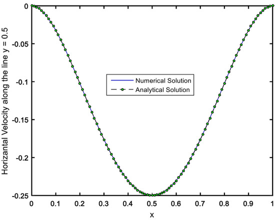 To appraise the precision of our numerical procedure, we solved the problem provided by Shih and Tan [32] by developing our code. In [32], it was assumed that the top lid of cavity moved with variable velocity . Further, the cavity was filled with a classical Newtonian fluid in the absence of any dipole. There is an analytical solution for this problem, in which the velocity distributions are defined by and . The horizontal velocity profile (calculated analytically and numerically) has been compared in Figure 3.