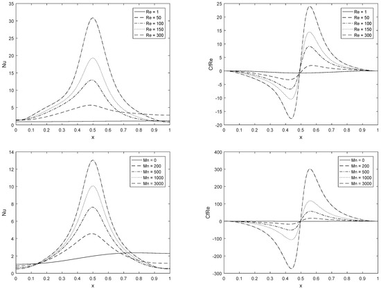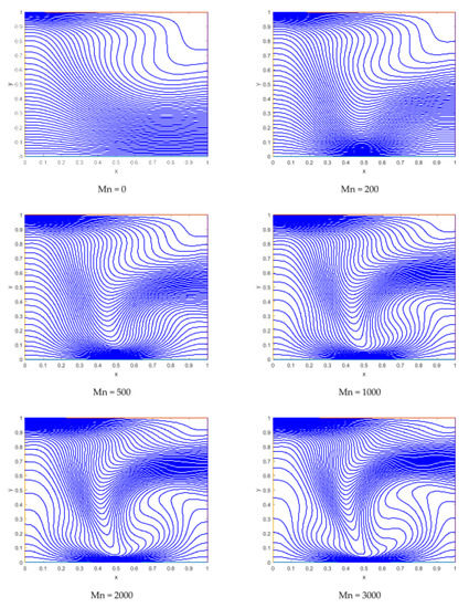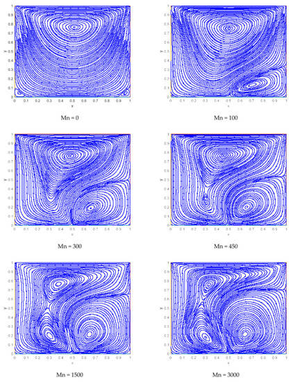 Table 6 shows that magnifying the magnetic parameter up to 3000 gives rise to and by 115% and 110%, respectively, and a remarkable variation is found in the shear stress along the bottom lid of the cavity, while a negligible change is in . This means that the dipole is more efficient for shear stress along the lower wall rather than the upper wall of the cavity, and this happens due to the motion of the upper lid.