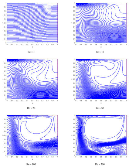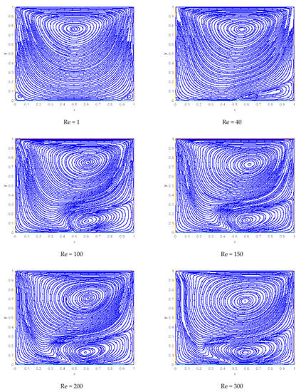 Figure 9 depicts that for , there is a single primary vortex and the direction of streamline from left to right, it is due to the movement of the upper lid from left to rightward, which is why the flow velocity is more enhanced near the top lid. As we increase the Reynold number, another lowering anticlockwise vortex appears near the right wall of the bottom lid. This newly formed vortex gets bigger and bigger near the dipole for higher values of Reynold numbers and it is originates near the dipole.