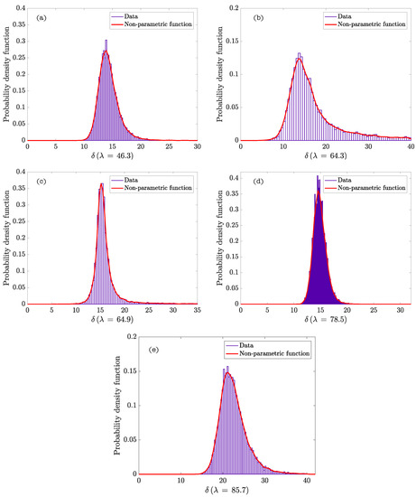 Probability density functions of for different values of ( = 46.3 (a), 64.3 (b), 64.9 (c), 78.5 (d), and 85.7 (e)).