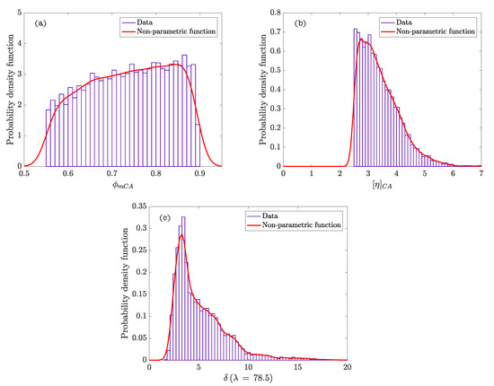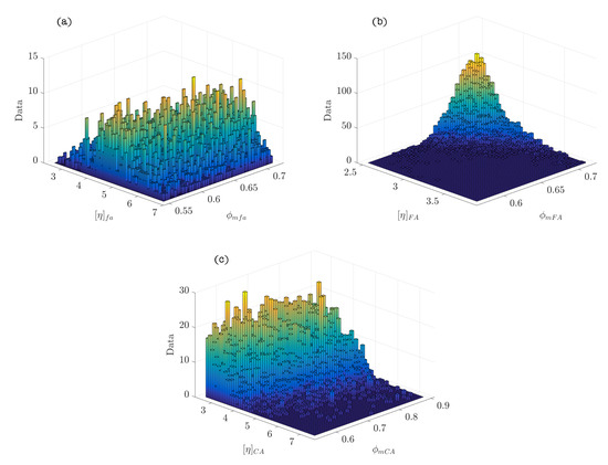 Figure 2 represents the hierarchy and dependence structure of the variables of the Bayesian network of the model. Five different SCSFRCs have been studied, corresponding to five aspect ratios, ( = 46.3, 64.3, 64.9, 78.5, and 85.7). Table 4 includes the statistics values obtained after the Bayesian analysis. Figure 3 and Figure 4 represent the probability density functions of the parameters for the phases of SCSFRC with = 78.5. The probability density function of the exponent of the Krieger and Dougherty equation () for the phases of SCSFRC is plotted in Figure 5. Finally, the bivariate histogram of the parameters and of the phases for the SCSFRC with = 78.5 is shown in Figure 6.