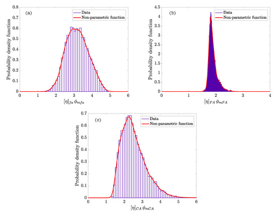 The parameters and [] of the equation of Krieger and Dougherty, Equation (1), which allows the prediction of the dynamic viscosity in cementitious suspensions, , may be expressed in probabilistic terms as a consequence of the inherent random nature of the phenomenon. The same consequence can be drawn for the constitutive model of the fiber to be used. The idea arises from the fact that the parameters of Equation (1) can be treated as random variables, described by probability density functions, and not as a single value. Thus, the conversion of both models into probabilistic ones through the Bayesian analysis makes sense and is interesting for improving the assessment of the dynamic viscosity.