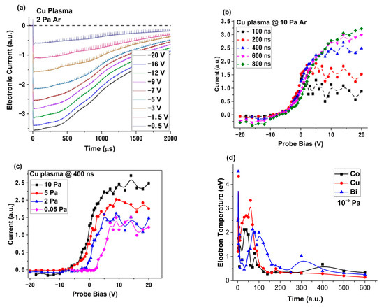 Selected signals from Cu plasma in 2 Pa of Ar (a), the IV characteristic of Cu plasma at various 10 Pa of Ar (b) and various moments in time (c), as well as the electron temporal evolution for Co, Cu and Bi plasmas (d) (lines are guides for the eyes).
