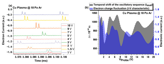 To explore the fireball-like phenomena induced during LP measurements, we have represented the electron current collected, versus time, for various biases (Figure 2). We observe that the positive peaks in the current are not synchronized and appear at different random moments of time for specific probe biases. This dependence is represented in Figure 2b (grey). The modulation in electronic charge, as function of probe bias, well-overlaps the temporal shift of the oscillatory sequence. This means that the two non-linear phenomena are correlated and have a similar nature. It was also found that the increase of working pressure enhances the correlation between the two non-linear processes. This means that the Ar gas acts like a membrane that can build coherent correlations between phenomena that manifest themselves at different temporal scales (<1 μs for the Iesat and ms scales for fireball-like oscillations).