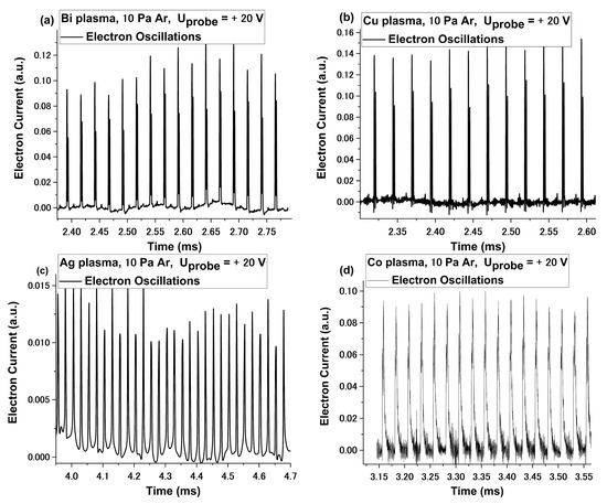 Example of oscillatory regime for Bi (a), Cu (b), Ag, (c) and Co (d) plasmas at (+20 V) at 10 Pa of Ar.