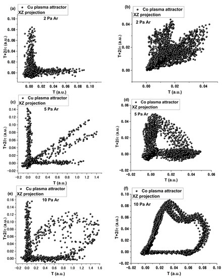 Further insight into the nonlinear properties of these oscillations and their stability, in terms of chaoticity and fractality of the system, can be extracted from the evolution of the strange attractors attributed to each oscillatory regime. Using the standard approach from [40], which implies the use of the autocorrelation function and Theiler temporal window, the strange projection of the strange attractors in the T and T + 2δτ, where the T is the time of the system (fireball-like structure), and δτ is the time period defined by the first zero crossing of the autocorrelation function. The selected results are presented in Figure 4 for Co and Cu, with the mention that the similar analysis was performed for Ag and Bi cases. In Figure 4, we observed that the attractor of the fireball-like structure exhibited two arms, defining two distinct trajectories in this correlation phase. This was seen for all investigated plasmas. With the increase of Ar pressure, we observed that, for Co plasma, a bridge formed between the two arms, with a clear correlation between them. This means that the two trajectories are now connected and can influence one another. For the Cu and Ag cases (Ag not shown here), a third trajectory was defined in between the original arms. With the increase of Ar pressure, up to 10 Pa, the central trajectory extends and becomes the bridge between the arms of the attractor. The transition observed here is clearly correlated with the thermal and kinetic energy of the metallic LPP.