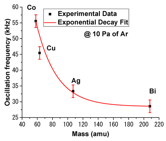 Finally, to confirm the nature of the perturbation, we have represented the oscillation frequency as a function of the target atomic mass. The results are presented in Figure 5. The experimental data was fitted with an exponential decay-type function (R = 97.9%). This result confirmed that the perturbation was of metallic nature and proportional to the atomic mass. The exponential dependence on the atomic mass means these were plasma-type oscillations. These results contradict the report from [14], where an oscillatory regime was discussed over a wide range of plasmas; an exponential increase proportional with the atomic mass was seen, and oscillations were in the MHz regime, with no interpretation of the surprising evolution.