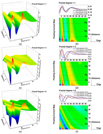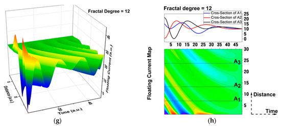 Space–time maps (1-(a); 3-(c); 8-(e); 12-(g)) of the floating current in 3D and contour plot representations (1-(b); 3-(d); 8-(f); 12-(h)) for various fractalization degrees (1, 3, 8, 12).