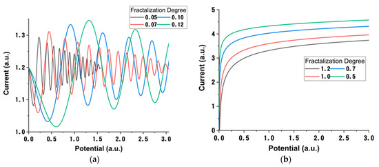 Once established that the multifractal model can generate temporal traces of the charges in the plasma, we will change the focus towards characterizing the measurable properties of the plasma. Therefore, by using the approach from (Equation (25)), we have obtained a law that described the variation of the saturation charge as a function of the multifractal potential. The multifractal potential, in the framework of our model, acts like an internal constrain of the plasma limiting particular kinetics. We have represented, in Figure 7, the saturation current, as defined in the multifractal paradigm variation with the fractal potential. The results show that, for small fractal degrees, there is a modulated-type function describing the current−potential relationship. A low fractalization degree would correspond to a free expanding plasma with limited interactions between particles and strong deviation from the ideal plasma conditions. Thus, ideal plasma conditions, from a multifractal perspective, would be achieved in a high fractalized medium. The changes in the fractalization degree of the system are also related to the nature of the ablated target, as properties such as evaporation temperature, particle mass or radius, and ionization potential are important factors that contribute to the overall value of the fractalization degree, as defined in this work. As the medium becomes more fractalized, it reaches optimum conditions, so that the classical approach to LP method can be implemented. This can be seen in Figure 7b, where the modulated behavior is replaced by an exponential increase, followed by a saturation regime. The results are in good agreement with the data presented in Figure 1.
