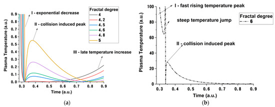 Finally, let us address the way a property such as plasma temperature is described in this multifractal framework. The understanding of plasma temperature, from the LP theory, offers a measurable information over the electron free, thermal movement in the plasma. The dynamics of electrons, especially in conditions of high background pressure, are dominated by collisions. In Figure 7, we showed that this is also a route to achieve thermodynamic equilibrium, which was presented in ref. [47], when by addition of Ar gas during LIBS measurement significant steps for establishing LTE were made. In the following, let us quantify the energy of the plasma through Equation (28), which represents the energy of the plasma induced by the internal forces acting on complex systems. In Figure 8, we have represented, by keeping a constant fractalization degree and having time as free parameter, the plasma temperature (in a multifractal paradigm understanding). For relatively lower fractalization degrees, we see that there are two contributions to the plasma temperature, one at short-time and a second one at later evolution times. This behavior is in line with the two-plasma structure scenario and can be related to the different natures of the main ablation mechanism. If the fractalization degree increases, we observed a third peak with a constantly increasing amplitude, and the one seen in the 0.7−0.9 regime was disappearing. This is a contribution to the plasma temperature induced through collision between the plasma and the background gas particles. Indeed, due to collisions, supplementary ionic groups can be induced in plasma, and the low energy ones can disappear they lose their kinetic energy fast and have become negligible to the overall plasma energy. This result is well in line with the experimental data presented in Figure 2 and previous reports of background gas effect on LPP dynamics [26]. In Figure 8b, we have represented the evolution of the temperature at a “extreme” value of the fractalization degree. We observe that, if the fractalization reached higher values, there are only two contributions: one at short-times, which is defined by an exponential decrease, and another at longer evolution times. These structures have a clear separation in the multifractal projection, and it appears as a decoupling in their interaction, as they do not influence each other anymore.