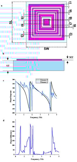 Graphical illustration exported from CST software: (a) metamaterial design, (b) side view, (c) phase response of elements ‘0’ and ‘1’, (d) phase difference.