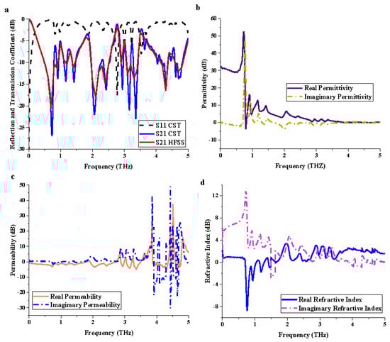 Figure 2 illustrate the physical properties of element “1” metamaterial design such as reflection and transmission coefficients, permittivity, permeability, and refractive index. The unit cell metamaterial was simulated by utilizing CST and HFSS software to validate the outcomes (as illustrated in Figure 2a). The comparison demonstrated minor discrepancies between both methods, and therefore it can be accepted for practical applications. Overall, the simulation in CST software exhibited seven resonance frequencies in the range from 0 to 5 THz which had more than −15 dB magnitude values. For example, 0.72, 2.06, 2.43, 2.95, 3.15, 3.36, and 4.31 THz resonance frequencies had magnitude values of −26.81, −21.95, −16.25, −16.06, −20.71, −22.88, and −15.81 dB, respectively. On the other hand, the permittivity and refractive index values, as illustrated in Figure 2b,d, revealed similar responses within the frequency range from 0 to 1.5 THz. Moreover, most of the responses of permeability values occurred in the range between 3.5 and 5 THz and reached a maximum magnitude value of more than −30 dB.