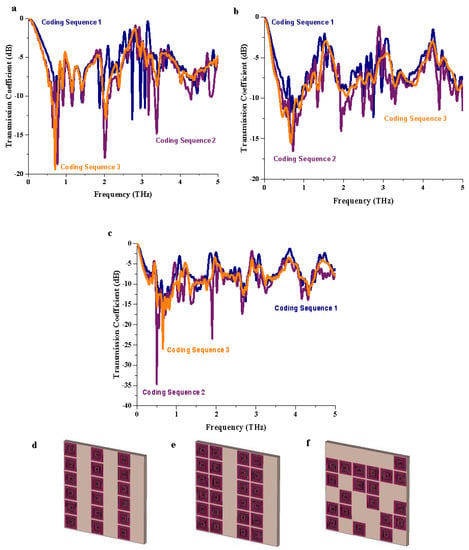 S21 results of (a) single layer, (b) double layer, (c) triple-layer; single-layer design of (d) Coding Sequence 1, (e) Coding Sequence 2, (f) Coding Sequence 3.