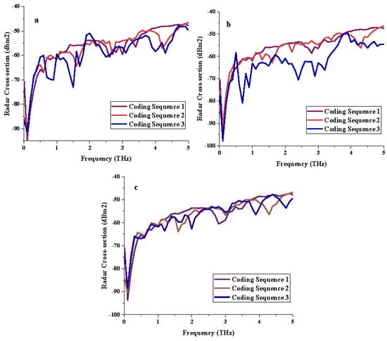 The RCS values demonstrated in Figure 4a–c clearly illustrate almost similar patterns for all three coding sequences and as well as for the multi-layered structures. Each coding sequence manifested RCS values between the ranges from −45 dBm2 to −100 dBm2 for every layer. However, Coding Sequence 1 for three different layered structures successfully exhibited less than −50 dBm2 RCS values at the frequency range from 4 to 5 THz. Moreover, the proposed Coding Sequence 3 with the single-layered structure was able to reach −50 dBm2 at 2 THz frequency. In summary, inconsistent RCS reduction patterns were manifested, and they were strongly influenced by both coding sequences and the number of layers.