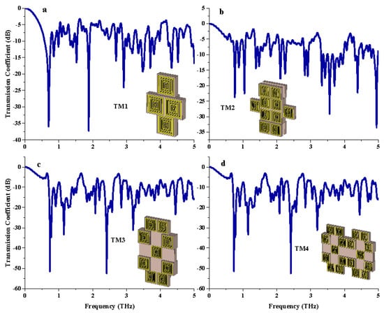 S21 results of three different tailored metamaterials for: (a) TM1, (b) TM2, (c) TM3, (d) TM4.